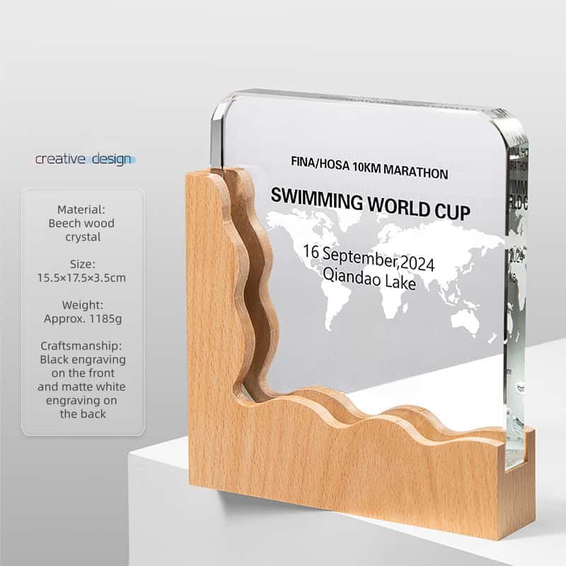 This trophy showcases a combination of crystal clarity, the warm tones of beech and sapele wood, and the artistic touch of inkstone. Its polished surfaces and balanced structure convey professionalism while standing securely on display.